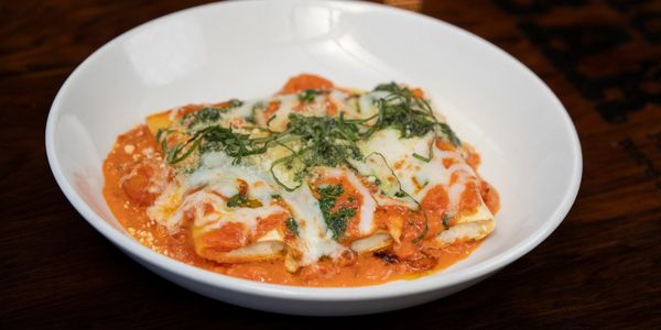 ricotta-filled manicotti, vodka sauce, mozzarella, arugula pesto, pecorino romano, fresh basil
