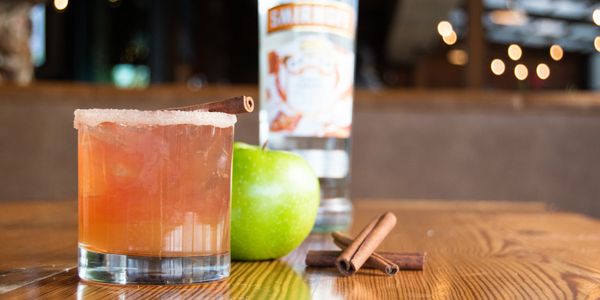 smirnoff caramel vodka, apple cider, monin granny smith puree, maple syrup, lemon juice, cranberry, cinnamon stick