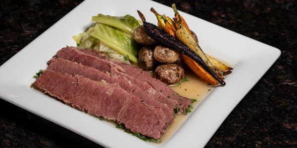 beer braised corned beef, braised cabbage, roasted marble confit potatoes, roasted baby carrots, corned beef au jus