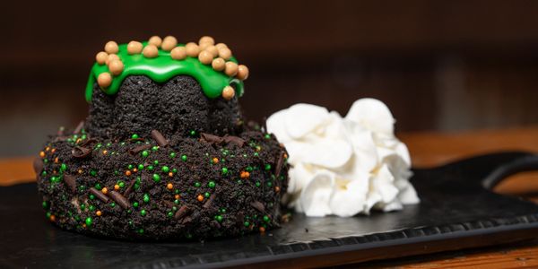 caramel cheesecake with a graham cracker and chocolate chip crust, coated in chocolate flakes, topped with guinness stout-infused fudge cake, covered in ganache and caramel crisps