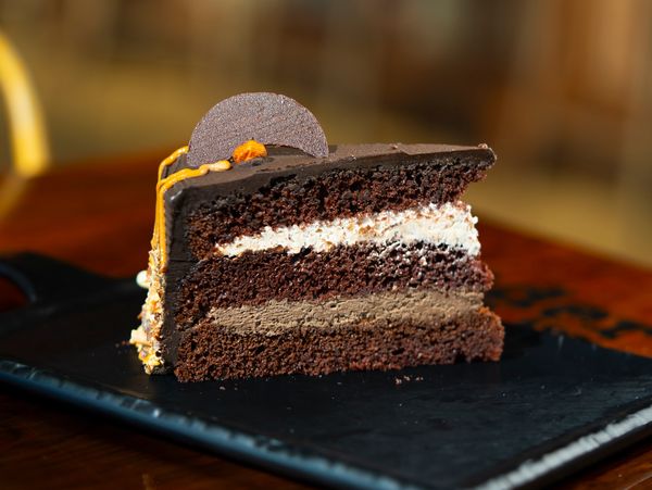 frangelico-infused chocolate sponge cake, chocolate mousse, hazelnut mousse, iced in chocolate ganache, topped with crushed hazelnuts